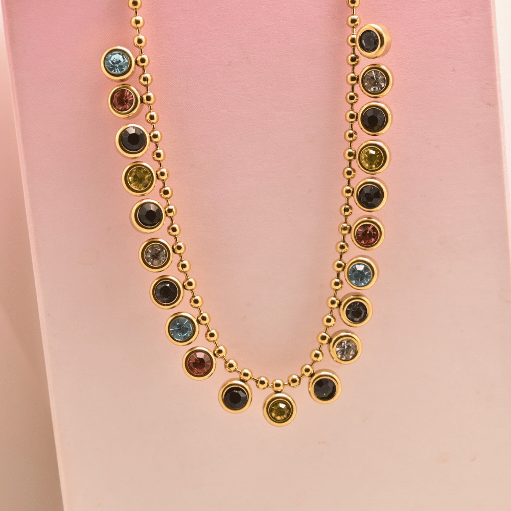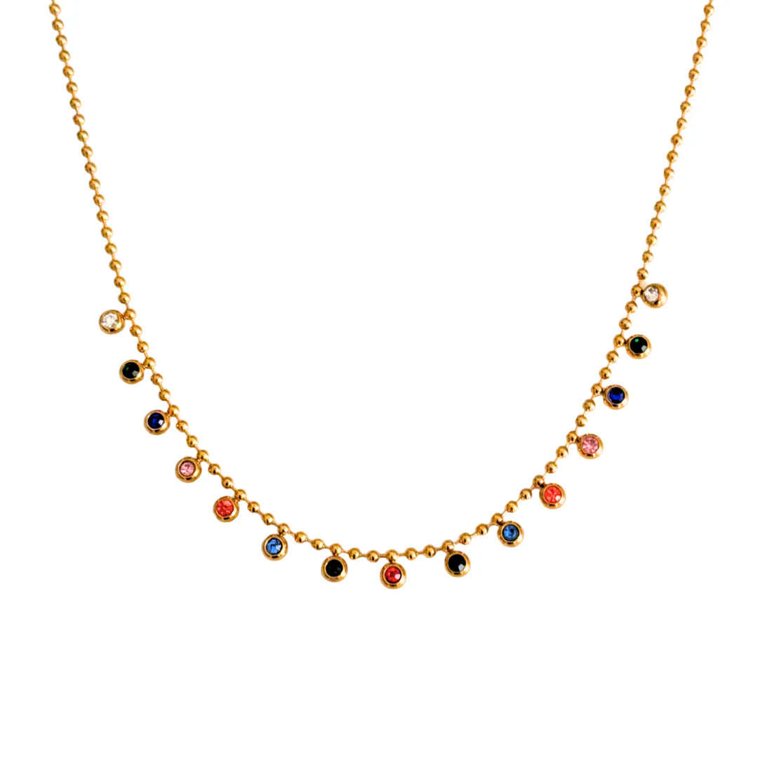 The Aurora Droplet Necklace is a celebration of color and craftsmanship. Featuring a dainty gold-tone beaded chain, it showcases an array of miniature multicolored crystals, each set in a refined round bezel. The stones are arranged in a rainbow-inspired palette, giving the necklace a playful yet sophisticated charm.