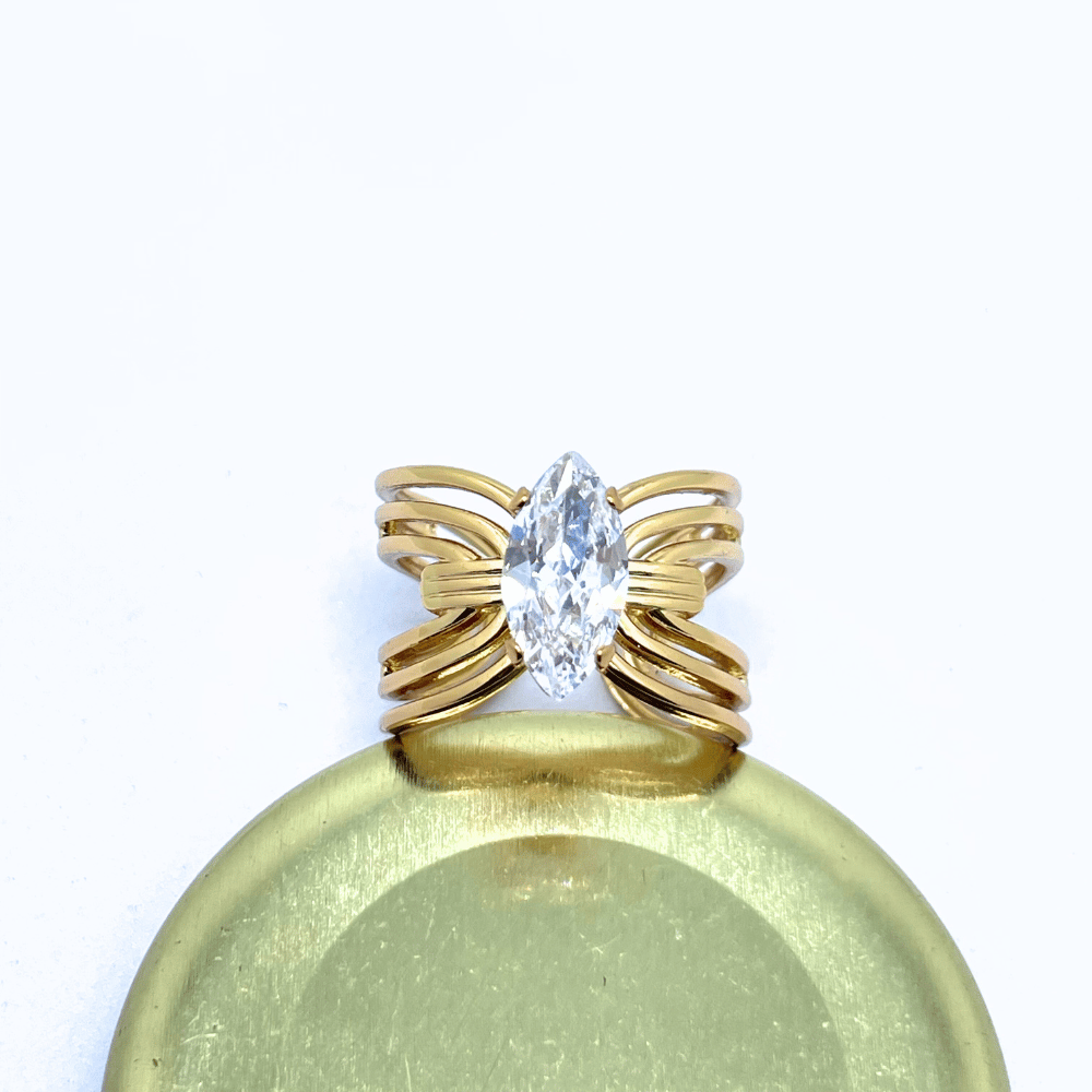 Grace your fingers with timeless elegance through the Eternal Marquise Ring. Featuring a stunning marquise-cut crystal that radiates brilliance, this ring exudes sophistication and modern charm. The multiple golden bands create a bold yet graceful design that beautifully enhances any outfit. Crafted with precision and comfort in mind, it includes an adjustable fit, ensuring it sits perfectly on any finger. A true symbol of elegance, this ring is made to shine with you on every occasion.