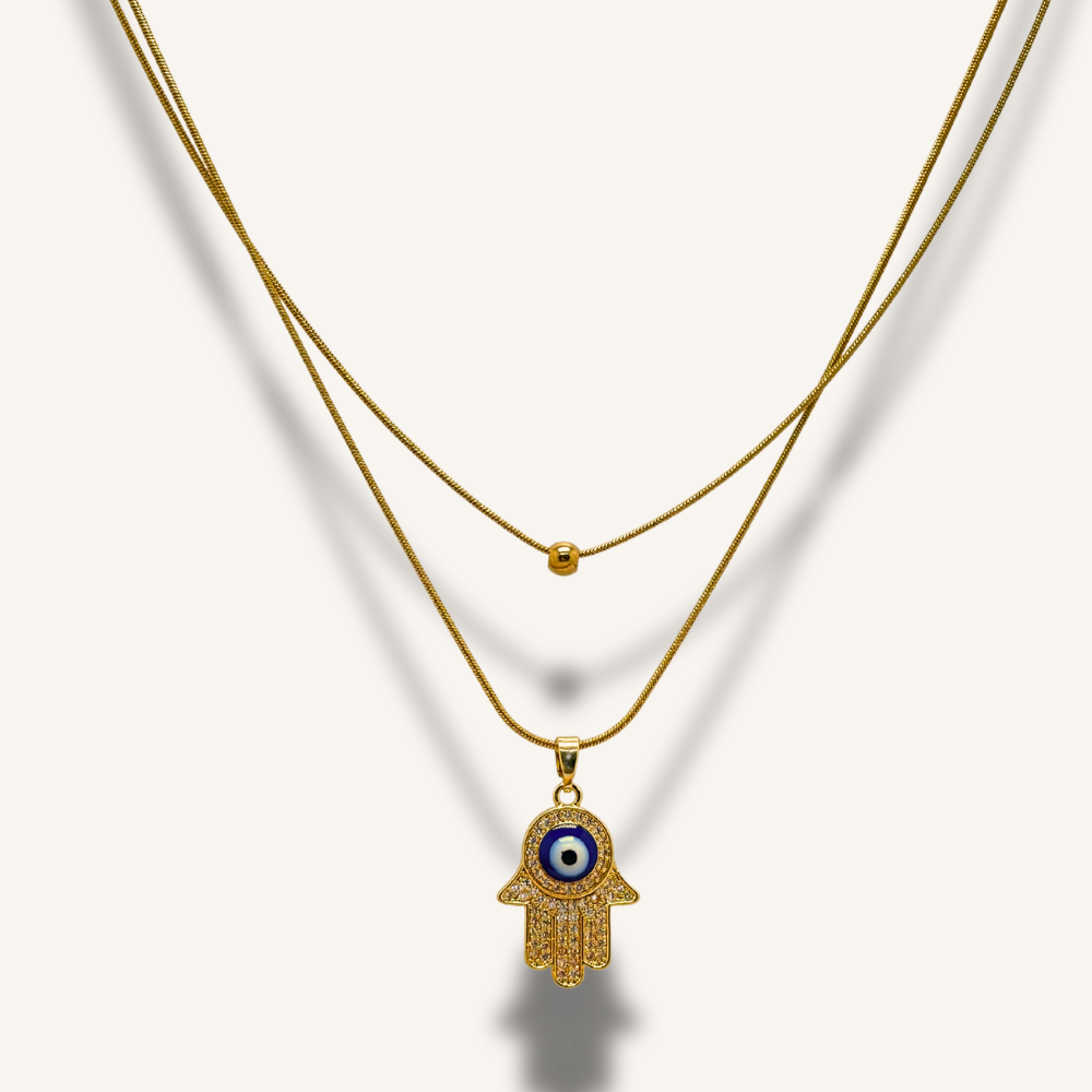 Bring balance, beauty, and protection into your everyday look with the Evil Eye Harmony Necklace. This dual-layered gold necklace features a radiant Hamsa hand pendant adorned with sparkling stones and a striking blue evil eye at its center — a timeless symbol of positivity and protection. Designed to harmonize style and spirit, this piece adds the perfect finishing touch to any outfit, whether worn solo or layered with other favorites.