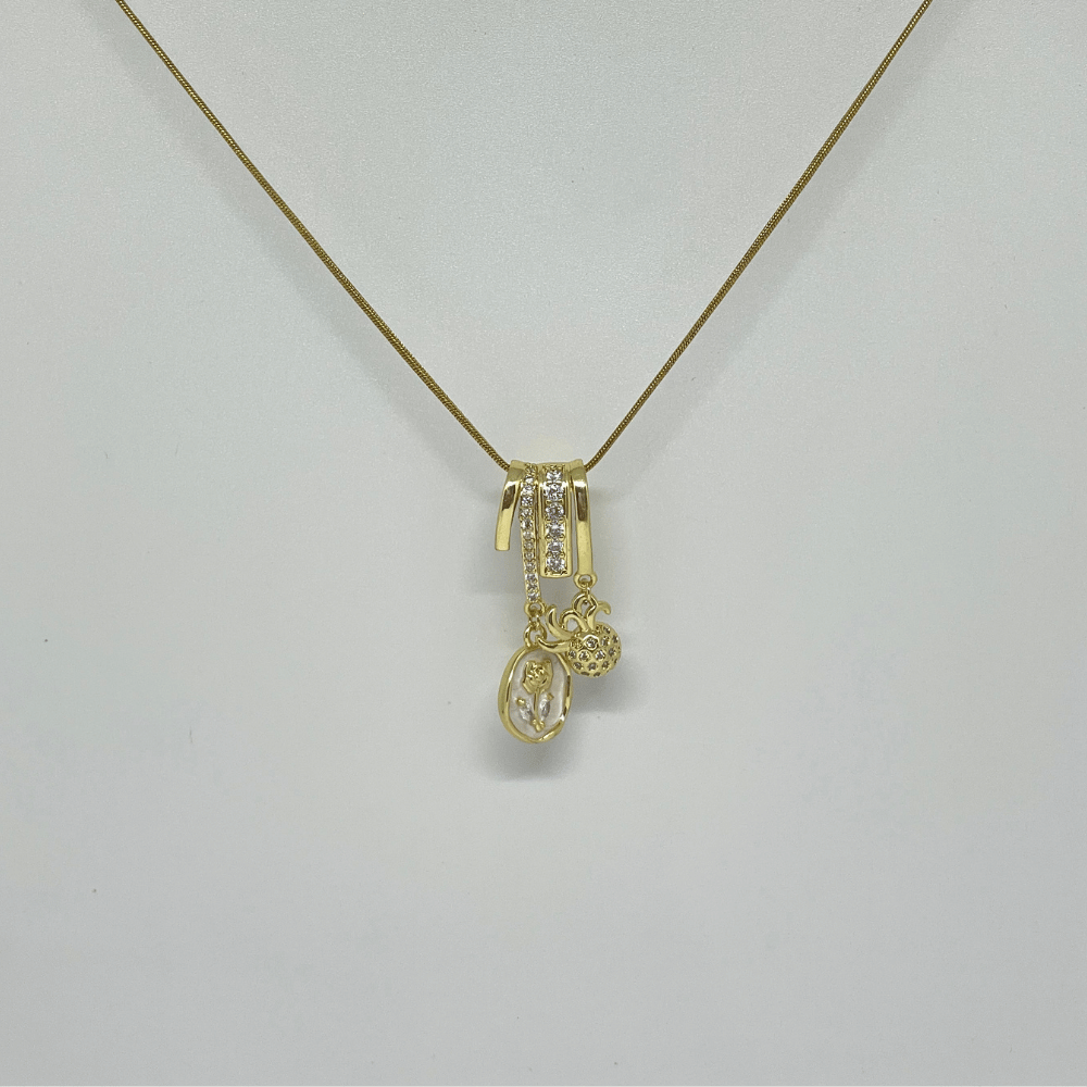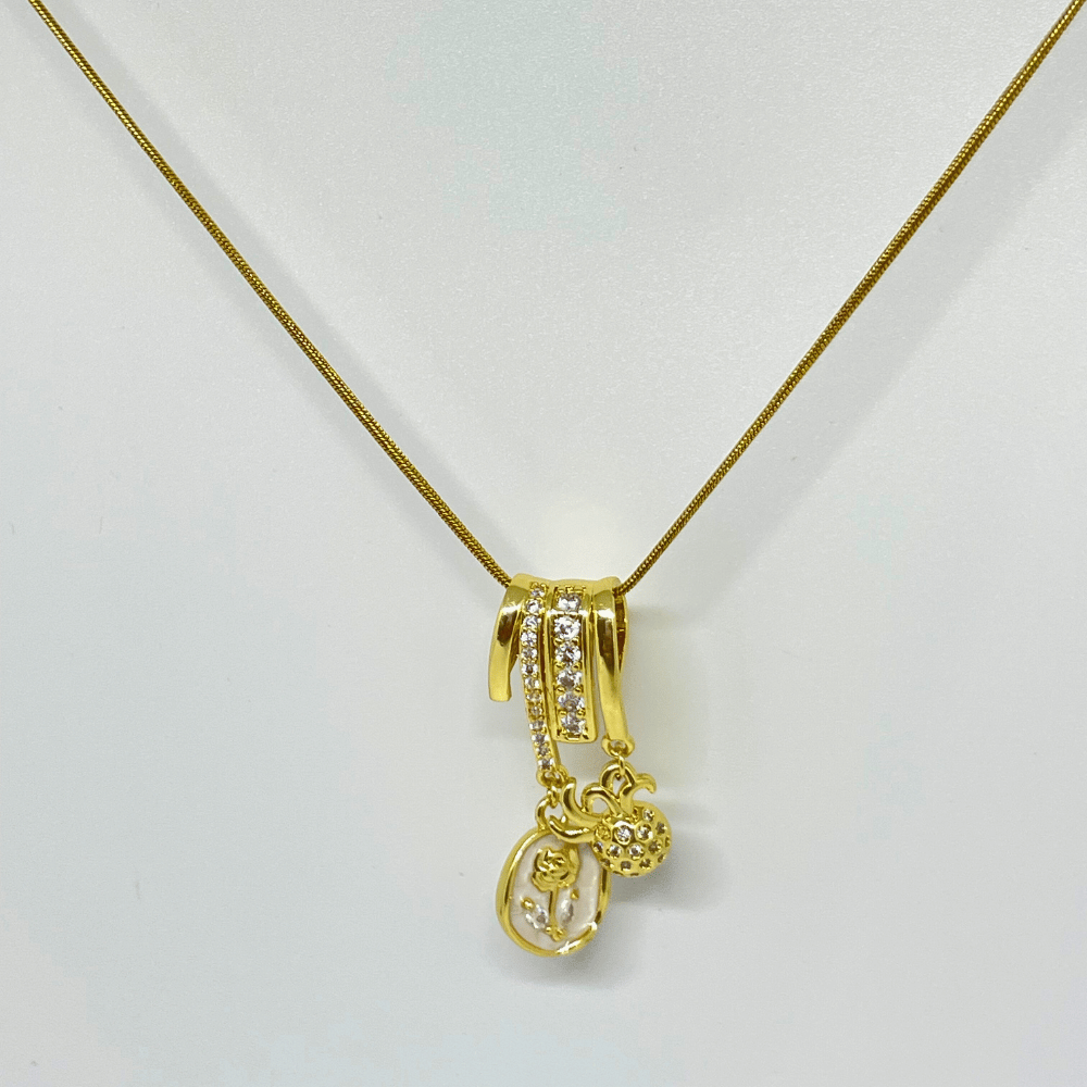 Subtle yet captivating, the Golden Whisper Pendant embodies grace and modern elegance. This exquisite piece features twin gold-toned charms — a crystal-studded sphere and a delicate transparent pendant enclosing a floral motif, symbolizing beauty in simplicity. The sleek golden chain enhances its refined allure, making it perfect for both everyday wear and special occasions. Radiating quiet sophistication, this pendant is your go-to accessory for an effortlessly polished look.