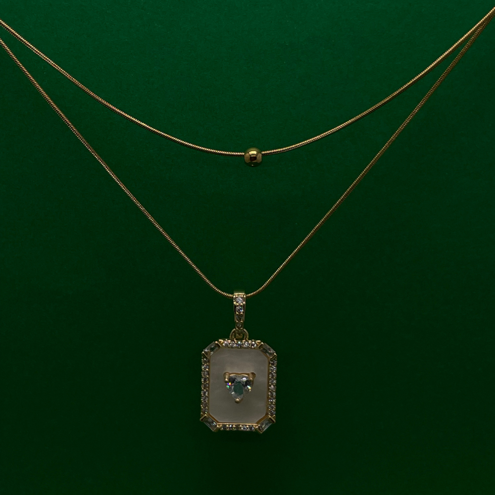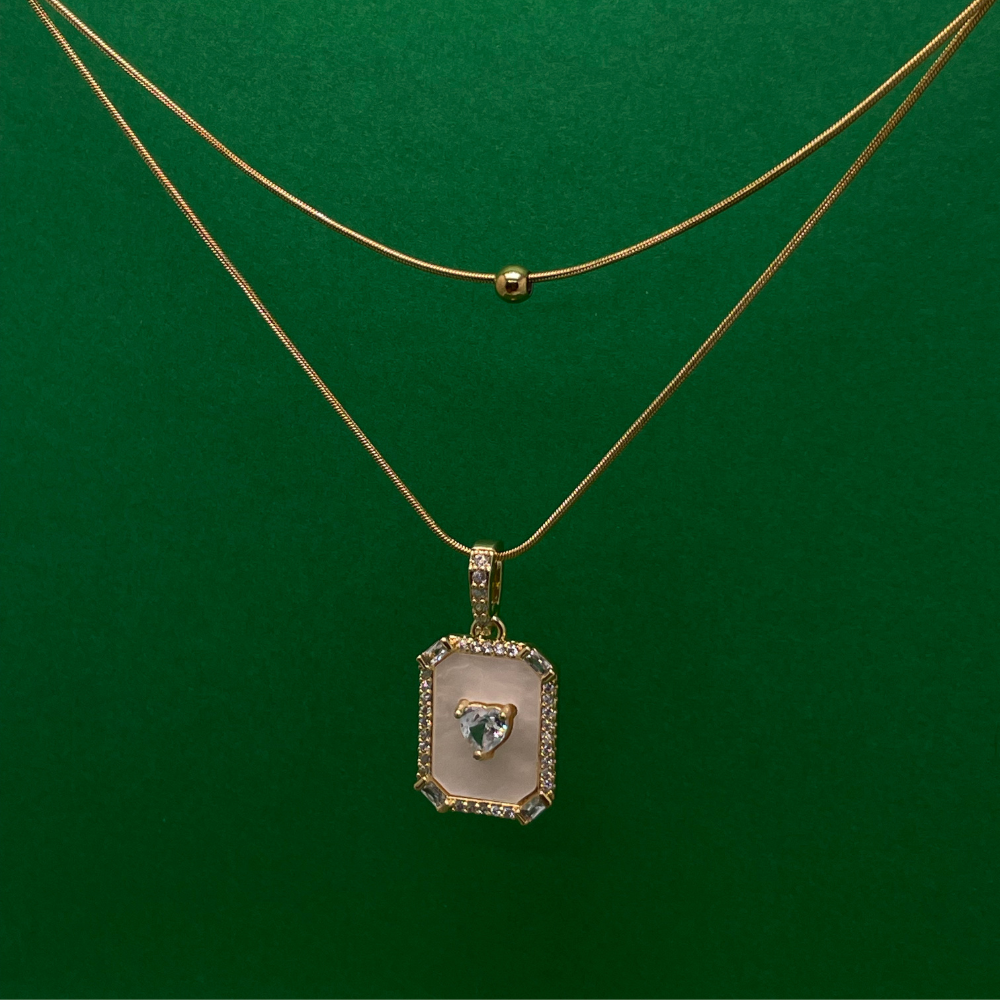 Radiate timeless elegance with the Heartstone Glow Necklace. This dual-layer gold necklace features a stunning rectangular pendant adorned with a luminous heart-shaped stone at its center, surrounded by delicate crystals for that extra sparkle. Its graceful design beautifully blends modern sophistication with a touch of romance, making it a must-have piece for every jewelry lover.
