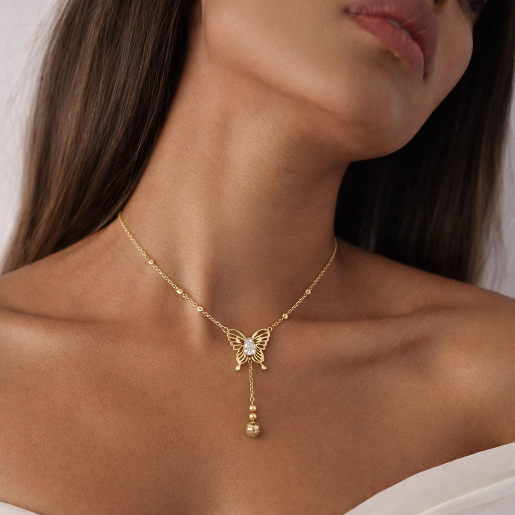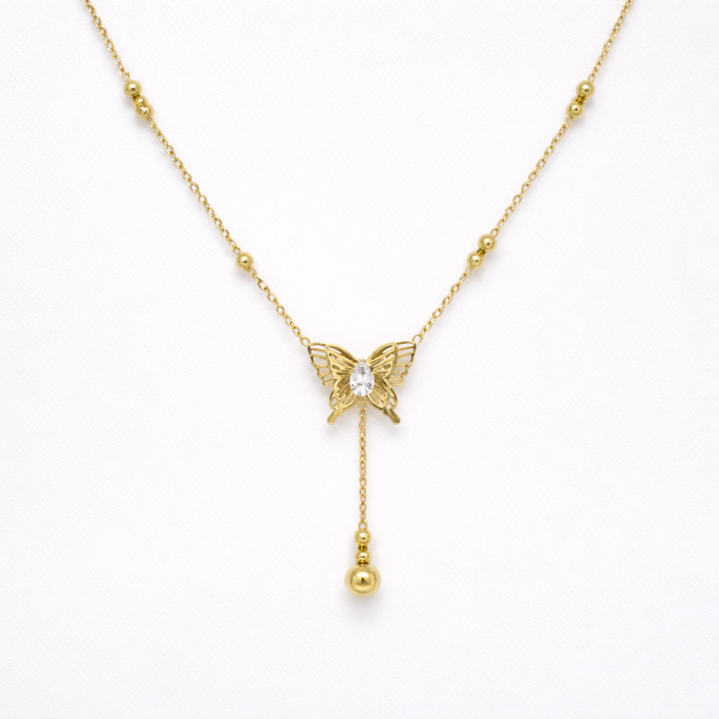 The Luna Butterfly Drop Necklace is a graceful blend of elegance and charm. Designed with a finely detailed butterfly motif and a shimmering crystal centerpiece, this necklace symbolizes beauty, transformation, and timeless style. The sleek gold-plated chain is accented with subtle bead detailing and completed with a refined drop charm that adds a luxurious finish.