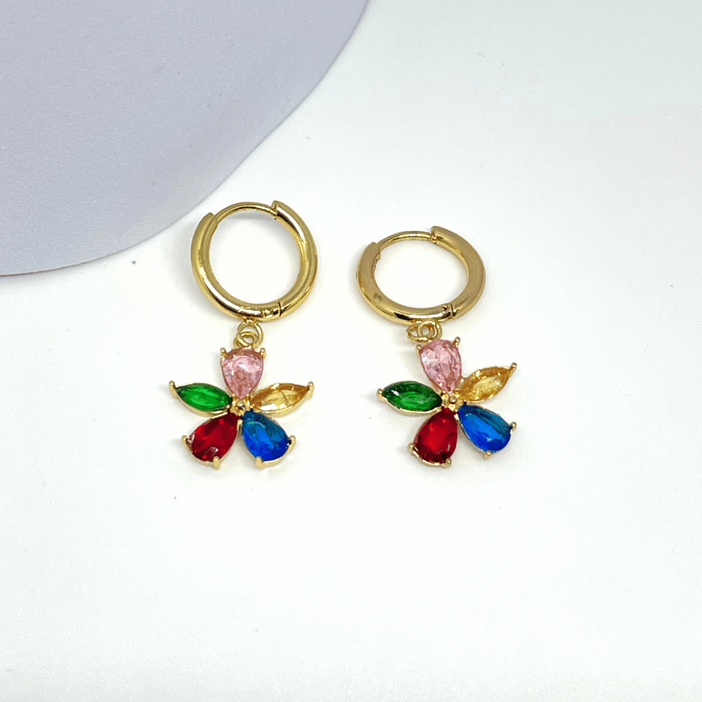 Designed to bring joy and vibrance, these playful earrings feature multi-colored gemstones arranged in a delicate floral pattern — a perfect mix of elegance and fun. Whether it’s a brunch date, a festive event, or your everyday statement look, these hoops will make you shine from every angle.