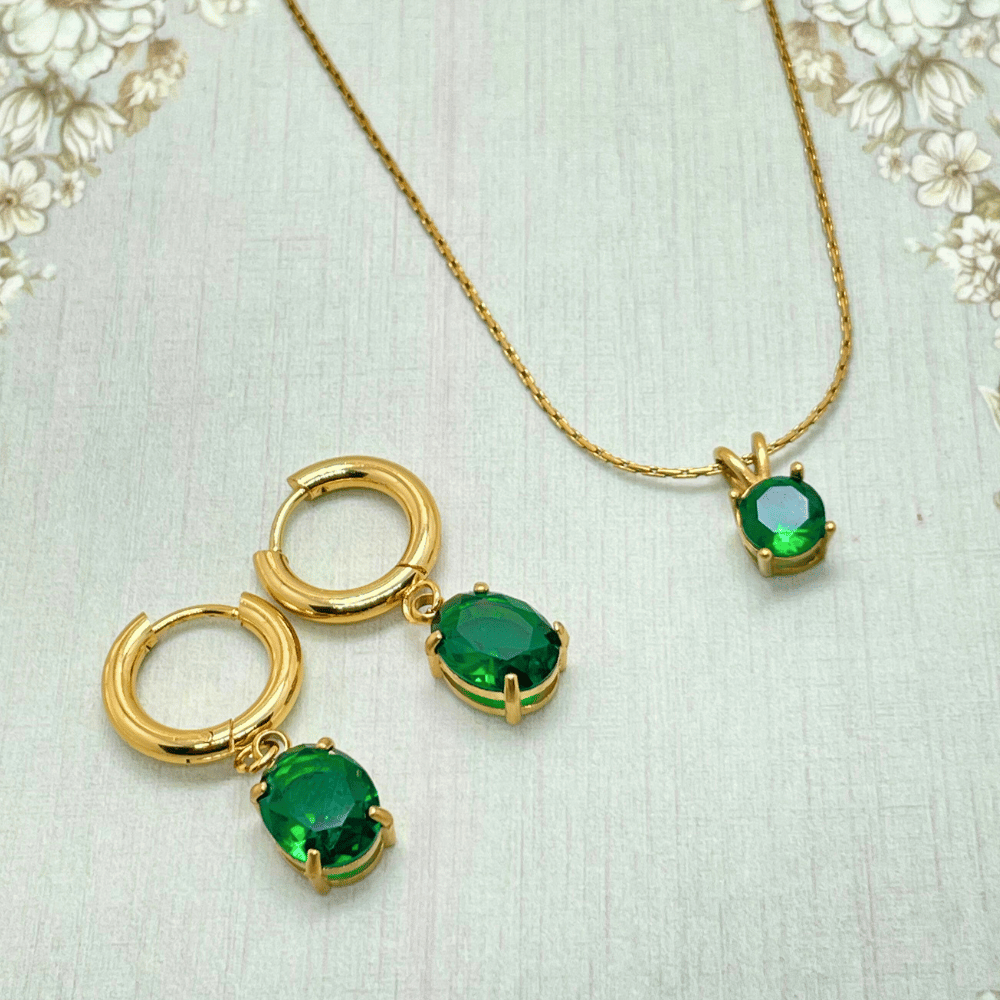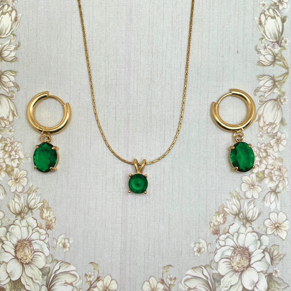 Embrace timeless royalty with the Royal Emerald Glow Set, crafted to capture elegance in its purest form. Featuring a radiant emerald-green stone set in a rich gold-toned finish, this set includes a delicate pendant necklace paired with matching drop hoop earrings.