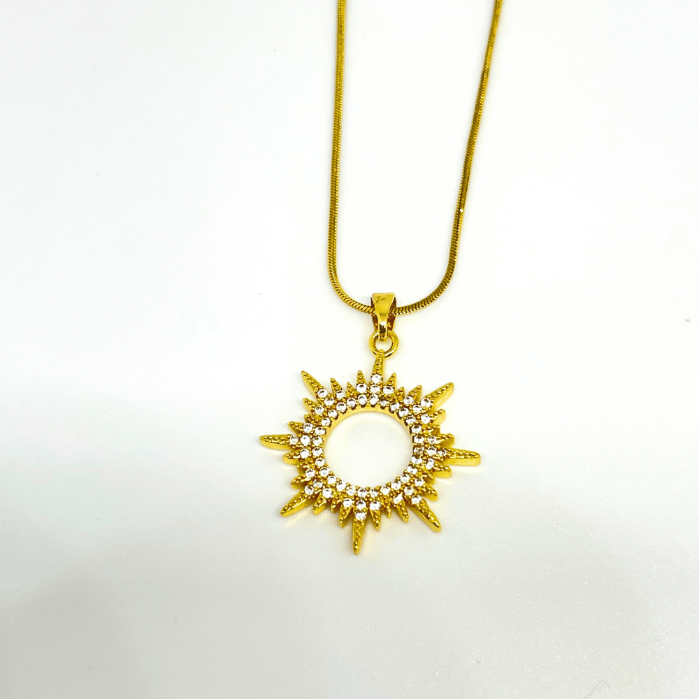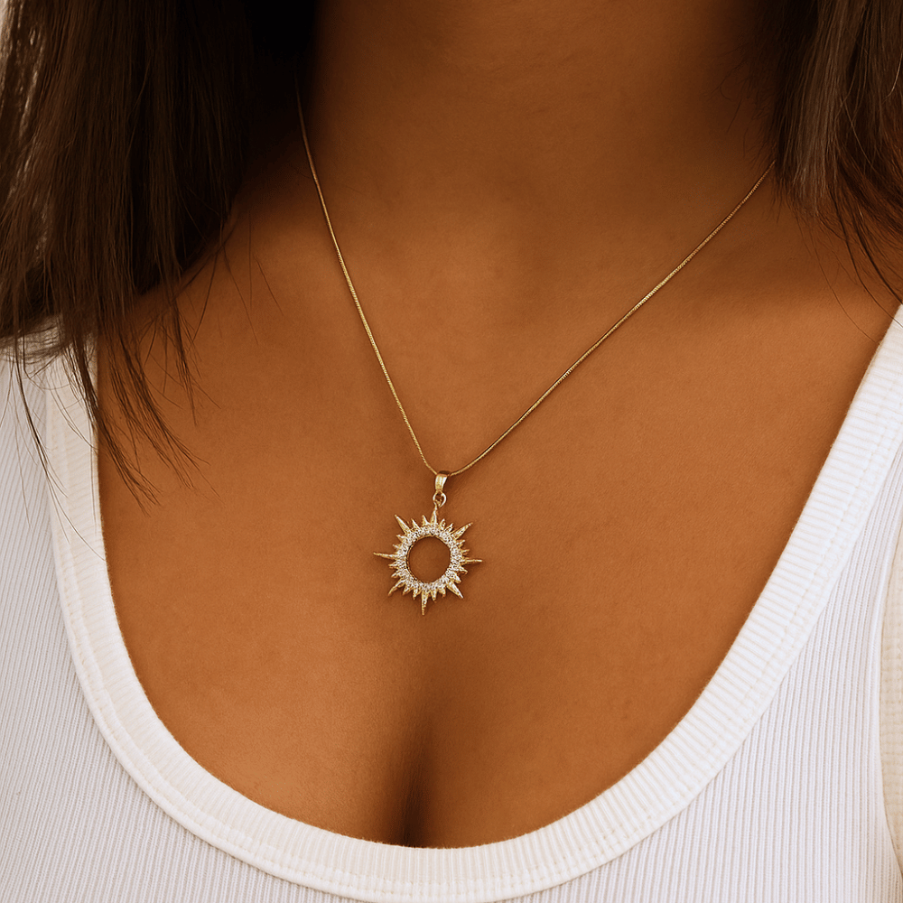 Illuminate your style with the Solar Gleam Necklace, a stunning piece designed to capture the brilliance of the sun. Crafted with a radiant gold finish, this pendant features a dazzling circular sunburst design adorned with shimmering stones that reflect light beautifully from every angle. Perfect for both everyday wear and special occasions, it adds a touch of warmth and sophistication to any outfit.