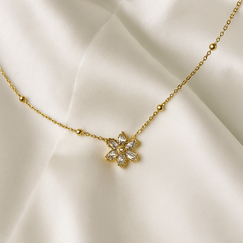 Capture the warmth of sunlight with this delicate Sunlit Flower Pendant. Crafted in radiant gold tones, this necklace features a beautifully designed floral motif adorned with sparkling stones that shimmer like morning dew. Its lightweight chain, accented with golden beads, adds a touch of grace and sophistication, making it perfect for both everyday wear and special occasions.