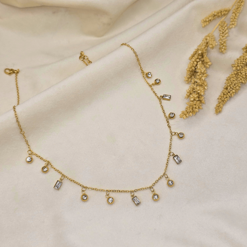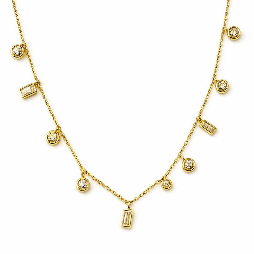 Add a touch of sparkle to your everyday style with the Twinkle Trail Necklace. Designed with delicate gold plating and adorned with alternating round and baguette-cut stones, this necklace beautifully reflects light with every movement. Its minimalist yet elegant design makes it perfect for layering or wearing solo as a statement of subtle sophistication.
